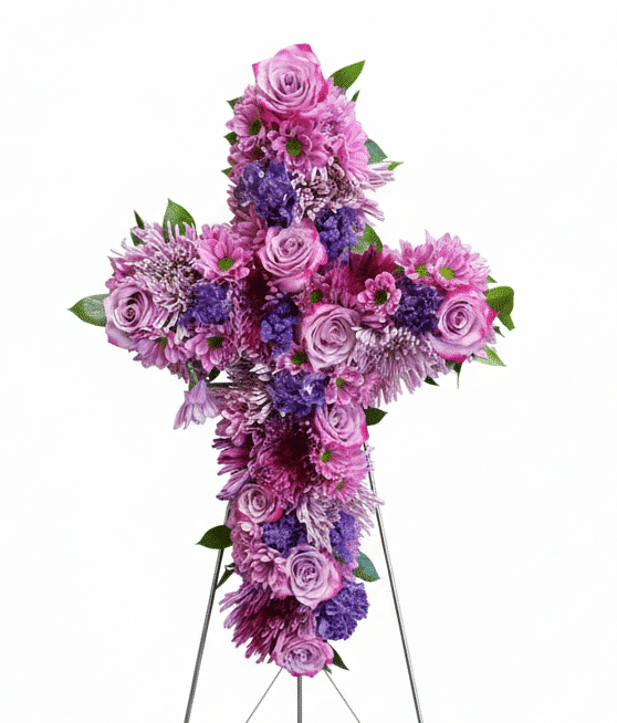 A stunning cross-shaped standing spray featuring soft pink roses, lavender carnations, and deep purple blooms. This timeless tribute symbolizes faith and everlasting peace, offering comfort to grieving families with its gentle beauty.