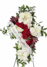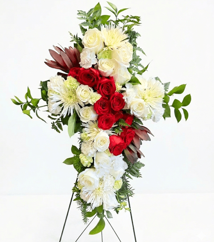 A meaningful cross-shaped standing spray featuring deep red roses, white lilies, and a flowing red sash. This reverent tribute beautifully expresses faith, devotion, and undying love.