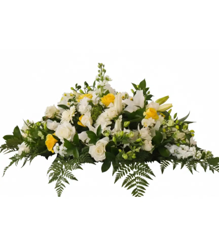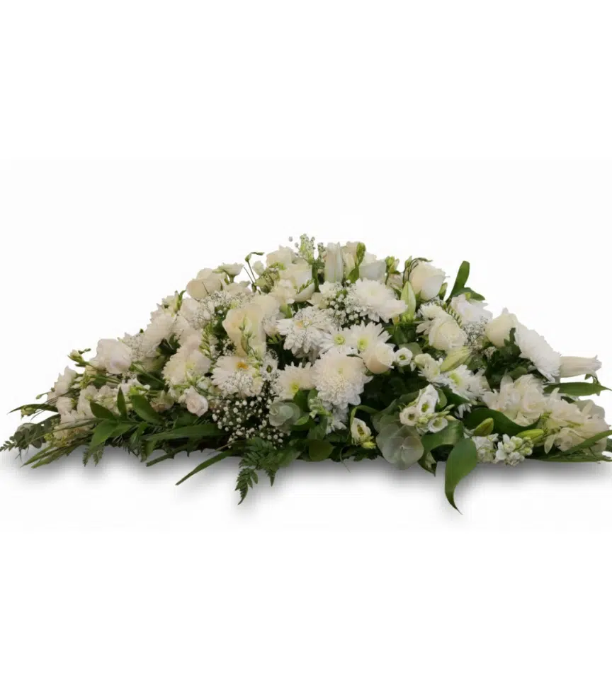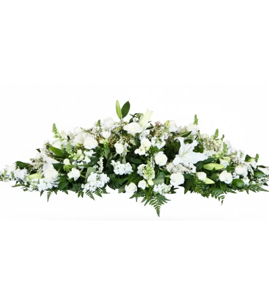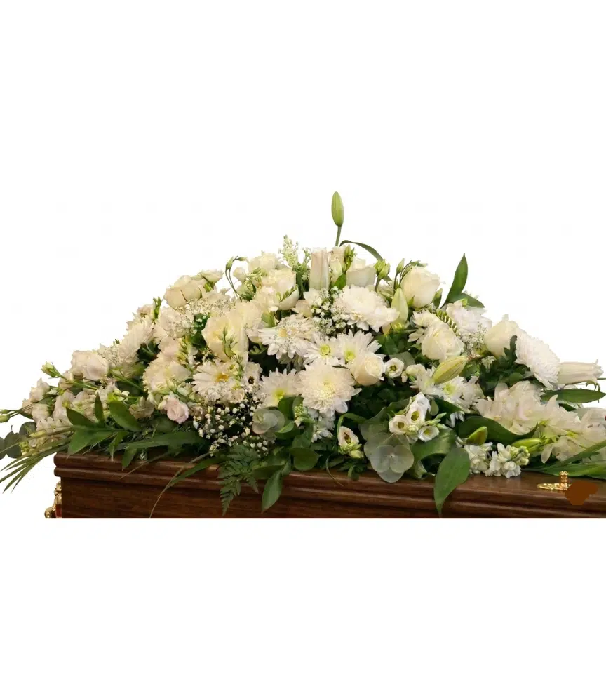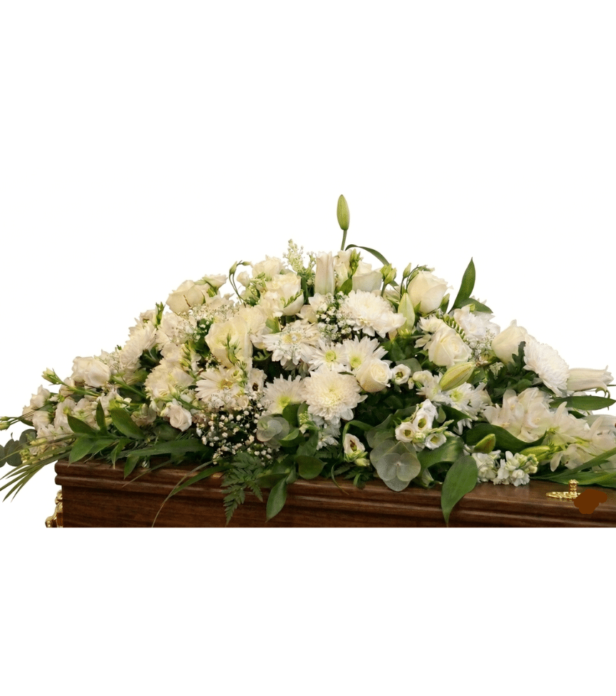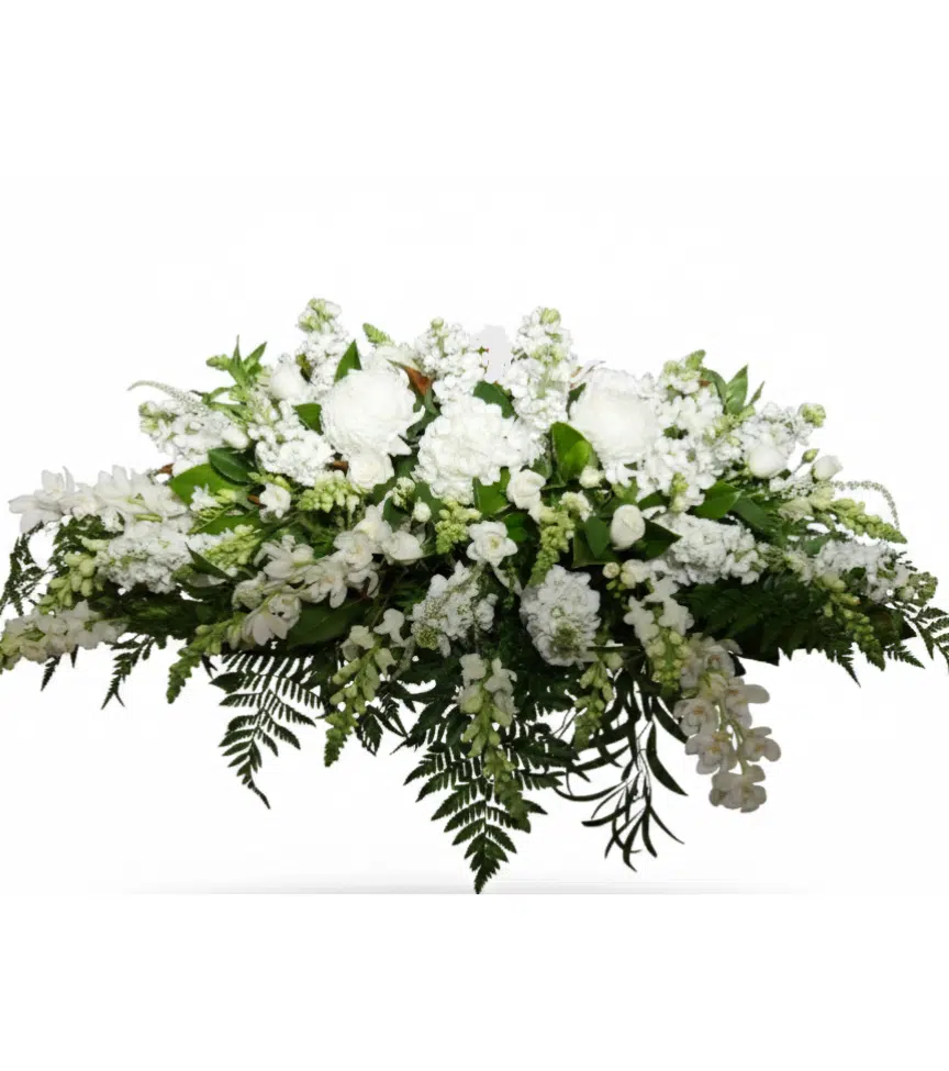 A full casket spray of crisp white blooms and lush greenery for a classic, distinguished look. This arrangement brings a sense of peace and solemn beauty to the service.