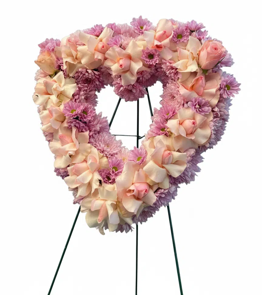 An elegant open-heart standing wreath adorned with blush roses, lavender carnations, and soft pink accents on an easel display. This heartfelt arrangement beautifully expresses enduring love and cherished memories.