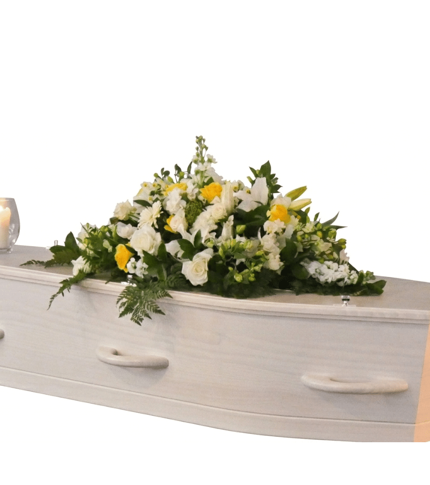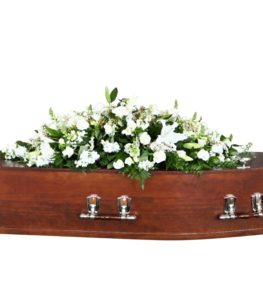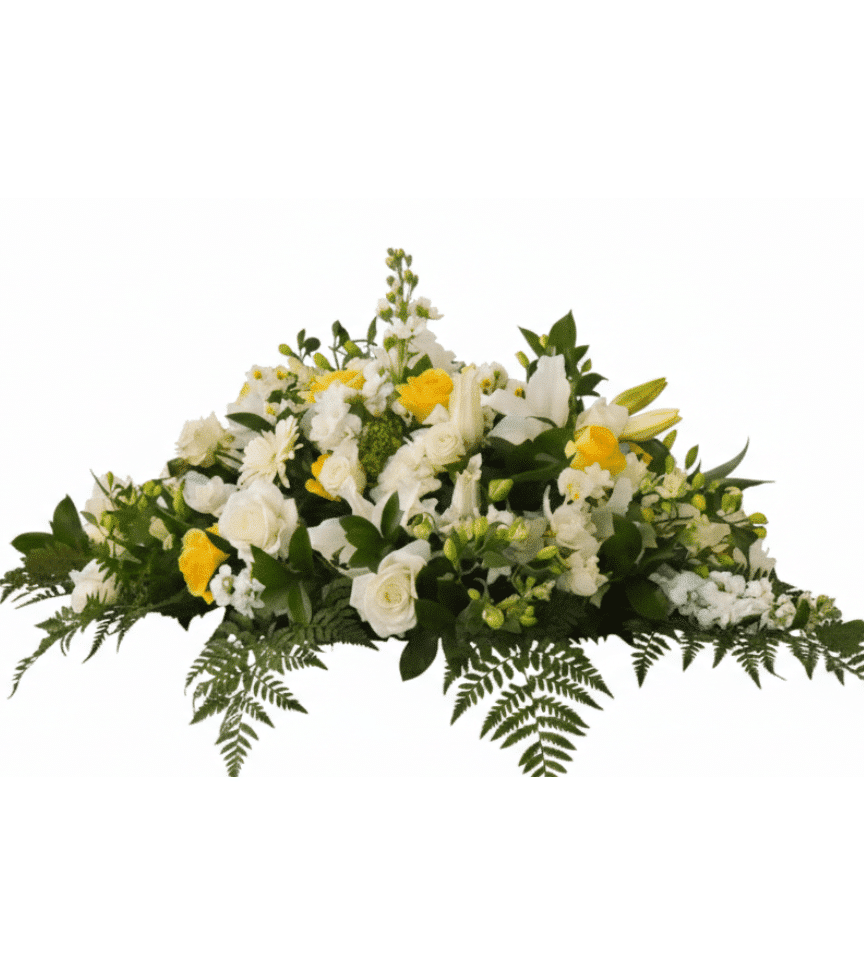 A lush casket spray blanketed in white chrysanthemums, cream roses, and soft greenery. This abundant arrangement drapes beautifully, creating a peaceful and dignified farewell for your loved one.
