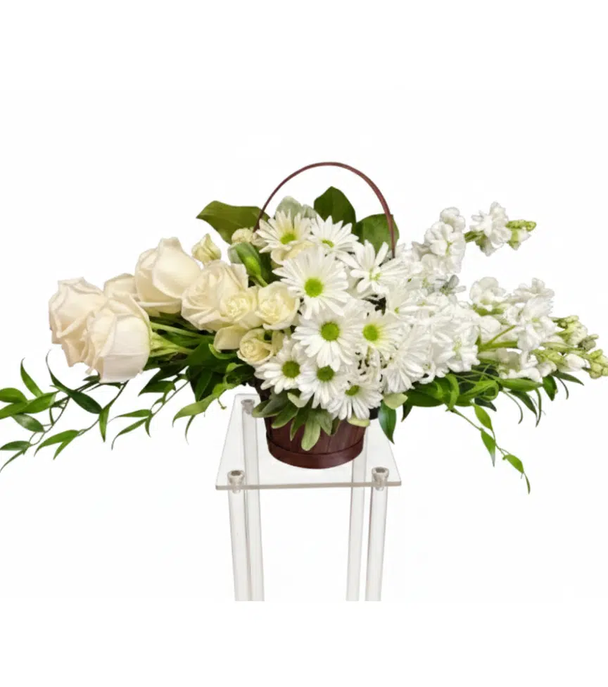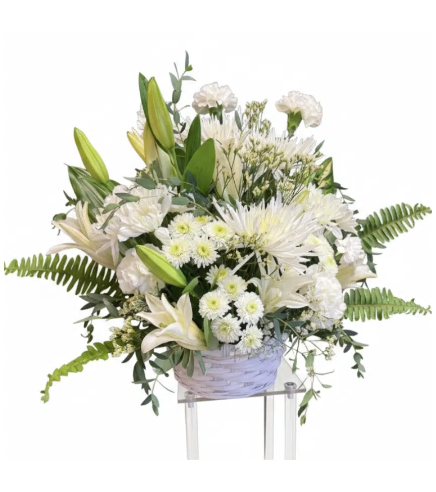 A graceful basket arrangement showcasing white lilies, ivory carnations, and soft greenery. This classic display radiates purity, elegance, and heartfelt sympathy.