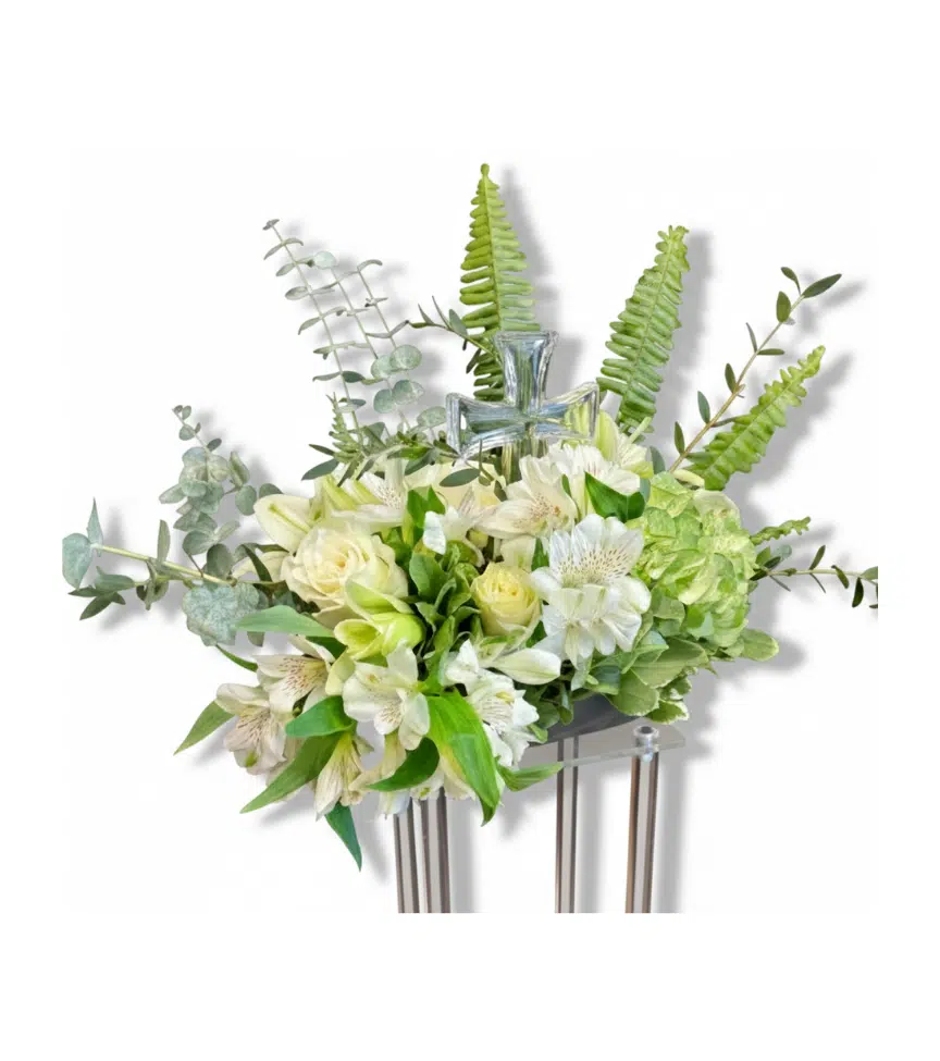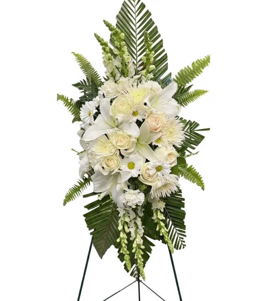 A graceful standing arrangement presented on a white easel, showcasing white lilies, ivory carnations, and soft greenery. This classic display radiates purity, elegance, and heartfelt sympathy.