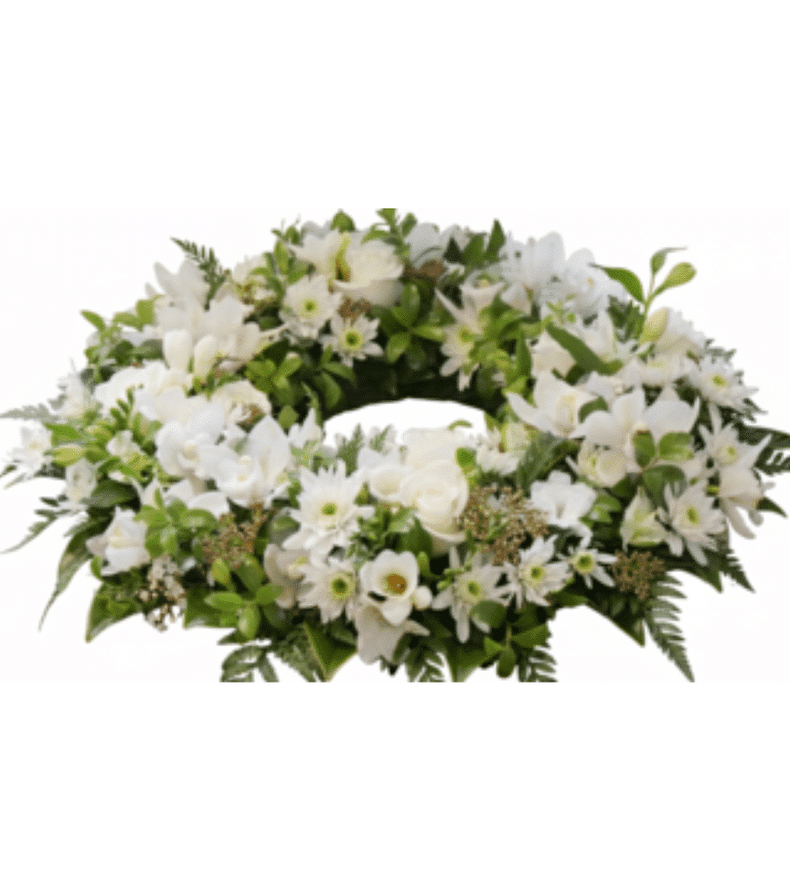 A graceful crescent-shaped wreath of white orchids, lilies, and soft greenery displayed on an easel. This ethereal arrangement evokes serenity and cherished memories with its flowing, natural design.