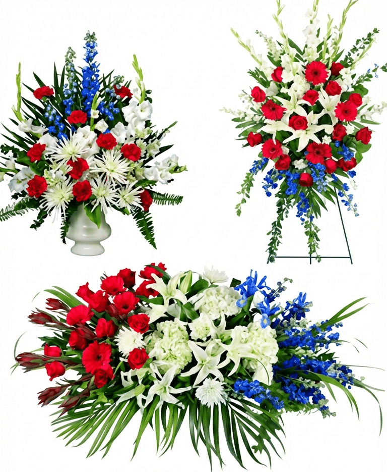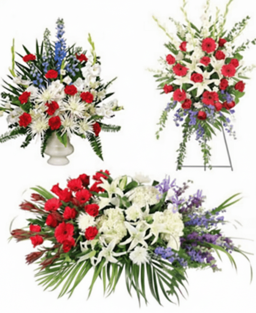 A premium multi-piece collection featuring vibrant red roses, white lilies, and blue accents arranged in complementary displays. This comprehensive tribute fills the space with warmth, color, and dignified beauty.