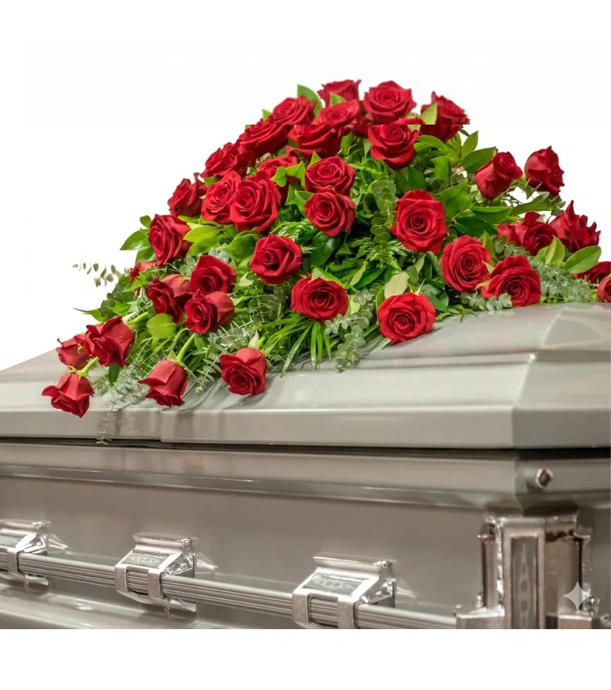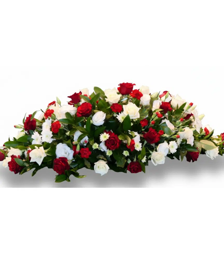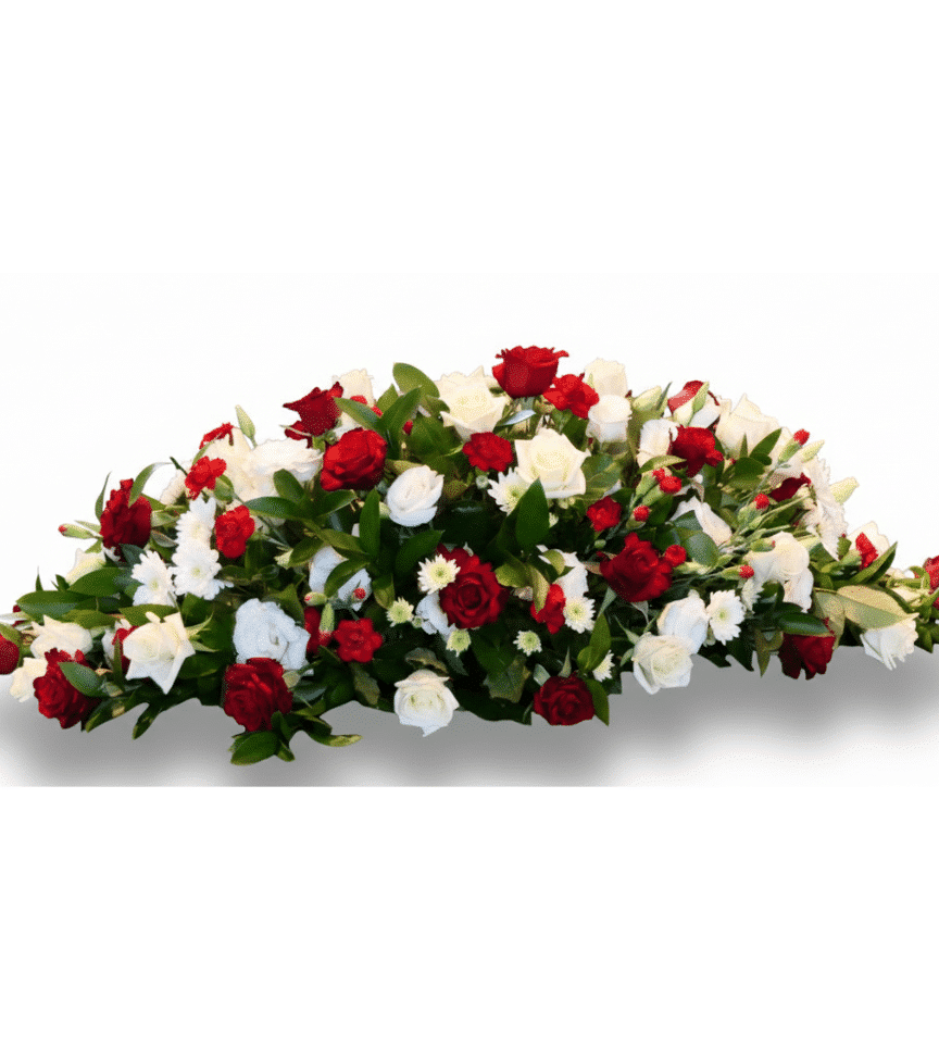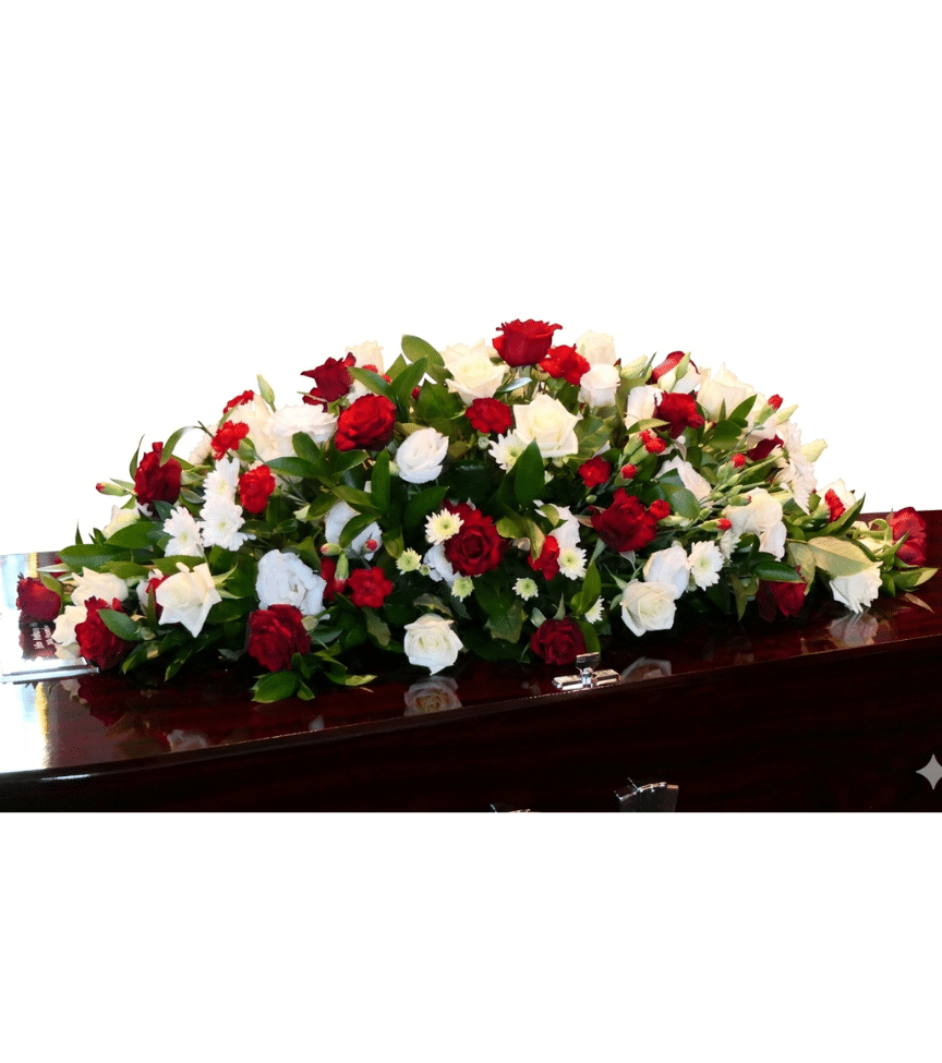 A full casket spray blending rich red roses with crisp white blooms and lush greenery for a classic, distinguished look. This arrangement brings a sense of peace and solemn beauty to the service.