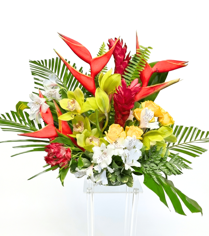 Stunning tropical arrangement with green orchids, yellow roses, and exotic flowers. A vibrant and energetic display bringing warmth and vitality.