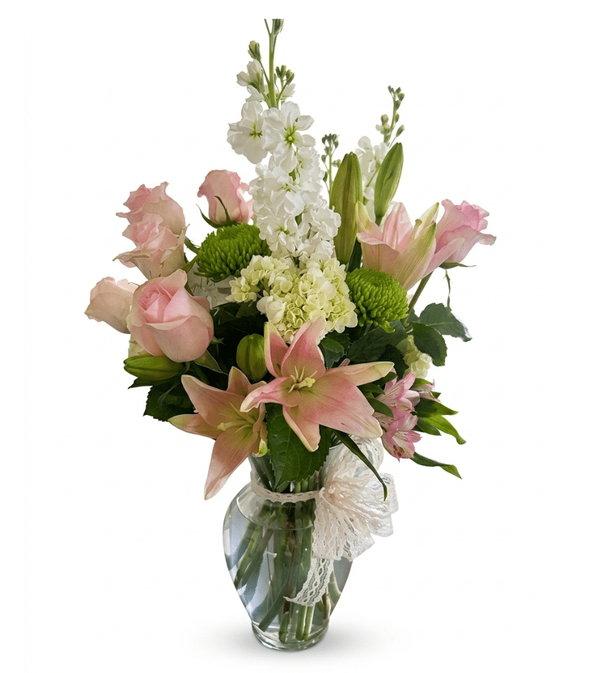 Garden-inspired arrangement with pink lilies, roses, and white stock in a tall vase. A lush and romantic display of natural elegance.
