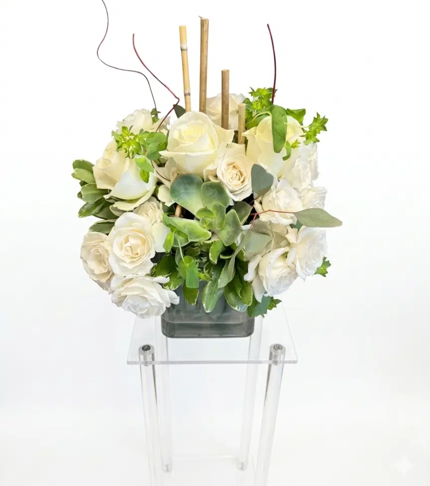 Sophisticated white rose arrangement in a cube vase with eucalyptus and decorative branches. A minimalist yet impactful floral design.