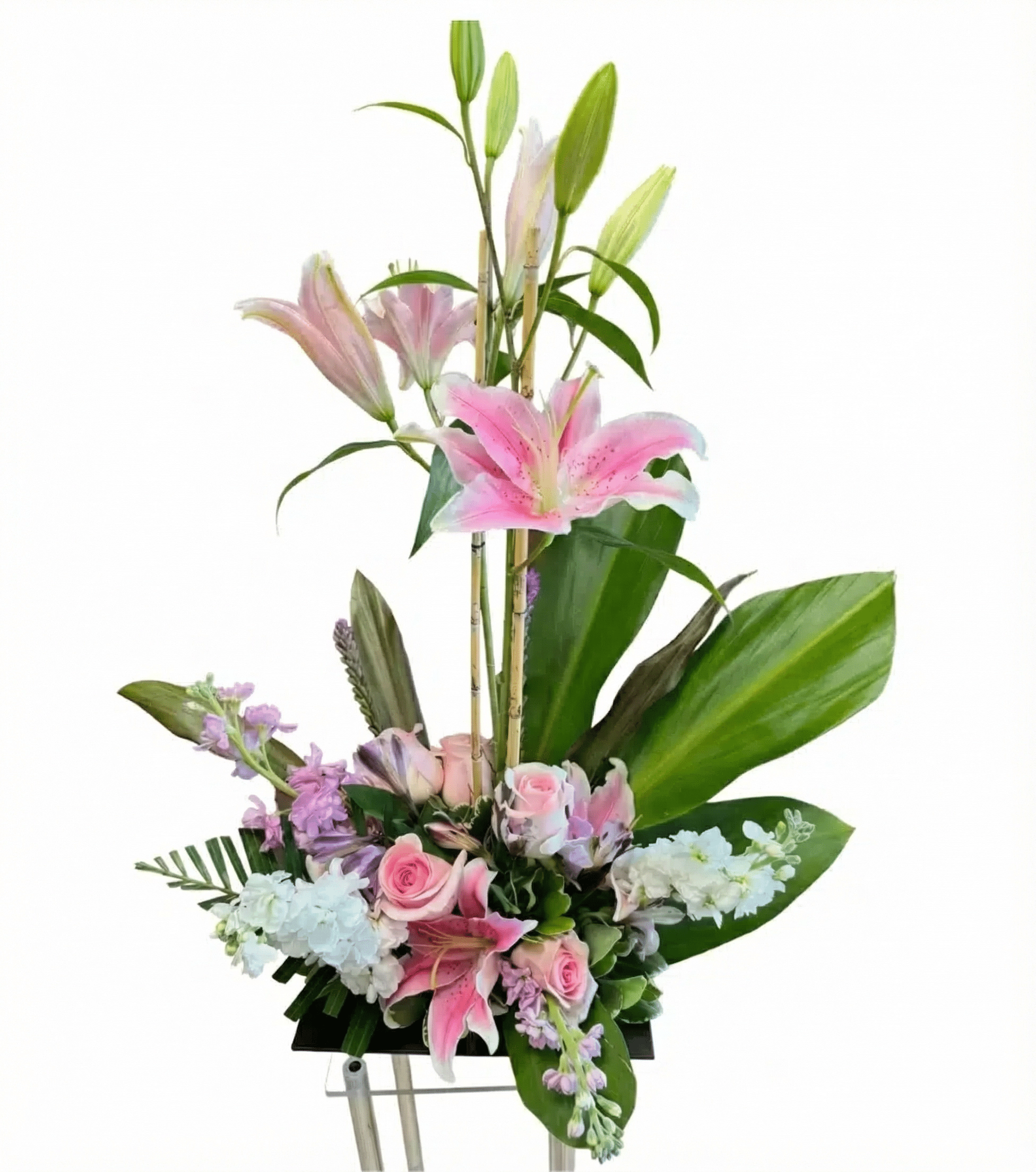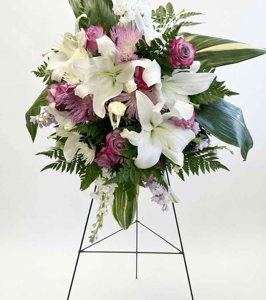 Romantic standing spray featuring white lilies, lavender roses, and white chrysanthemums. A graceful and expressive arrangement for meaningful occasions.
