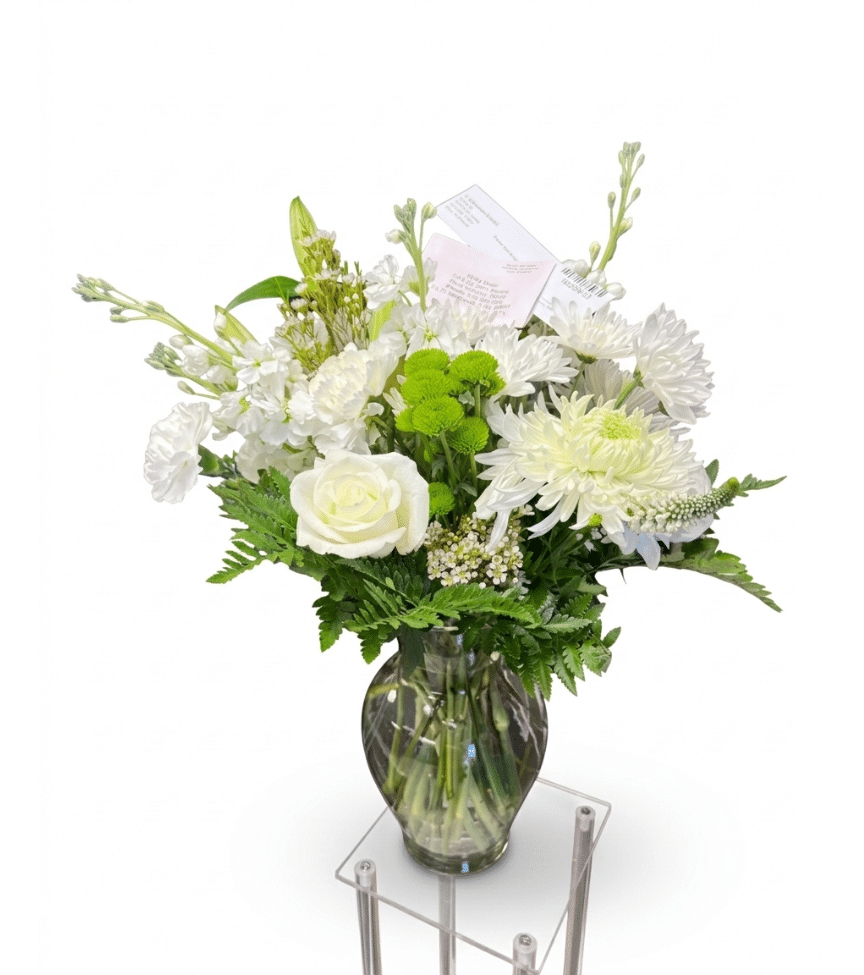 Charming arrangement filled with white flowers and greenery. A fresh and elegant display adding warmth and natural beauty to any setting.