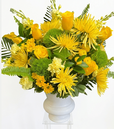 A warm and vibrant arrangement featuring yellow roses, white lilies, and soft greenery. This sunlit tribute celebrates a life filled with joy, warmth, and treasured moments.